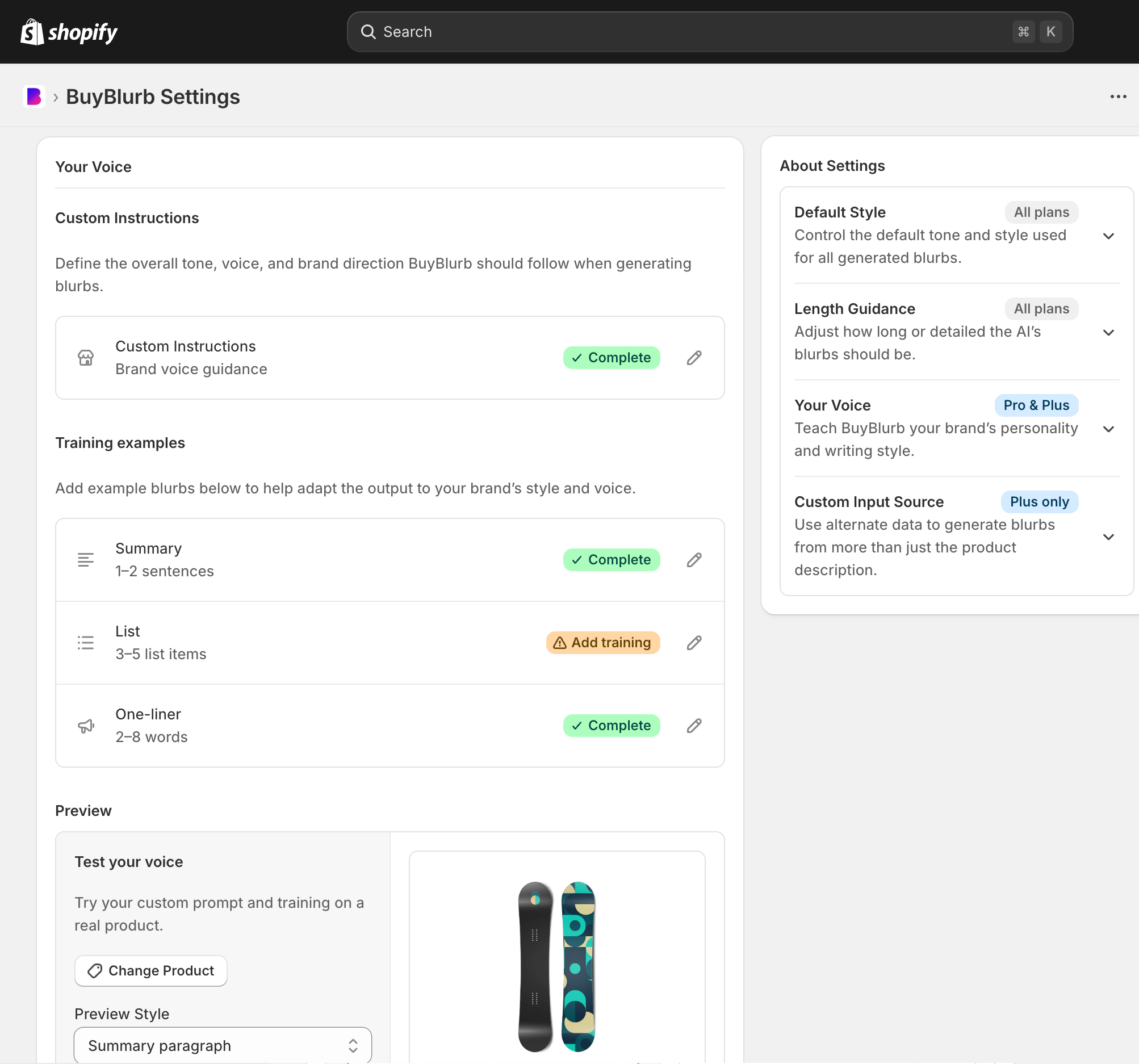 BuyBlurb works immediately after install. Merchants can choose from built-in tones and styles, or—on Pro and Plus—use custom instructions or AI training examples to match their exact brand voice.